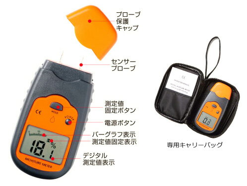 (赤・・・適していない、黄・・・使用可能な範囲、緑・・・最適)■ 仕様グラフ付きデジタル含水率計W65×H125×D30専用キャリーバッグ、9V角形乾電池付き 保証期間:1年間JAN:-※こちらの商品には保証書は付属していませんが、発送案内のメールを印刷したものや納品書があれば、保証を受ける事ができます。