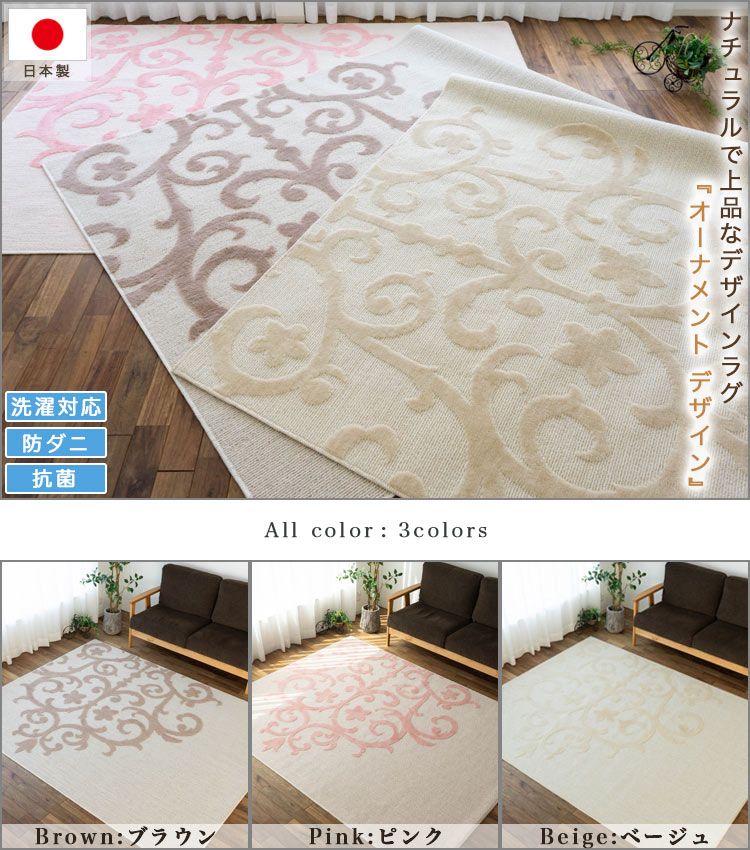 デザインと機能性を組み合わせた日本製ラグ! 優しい雰囲気の 『 オーナメントデザイン・ラグ 』 抗菌・防ダニ加工・お洗濯対応の、機能性を組み合わせた 安心してお使いいただける日本製ラグを是非お試しください。